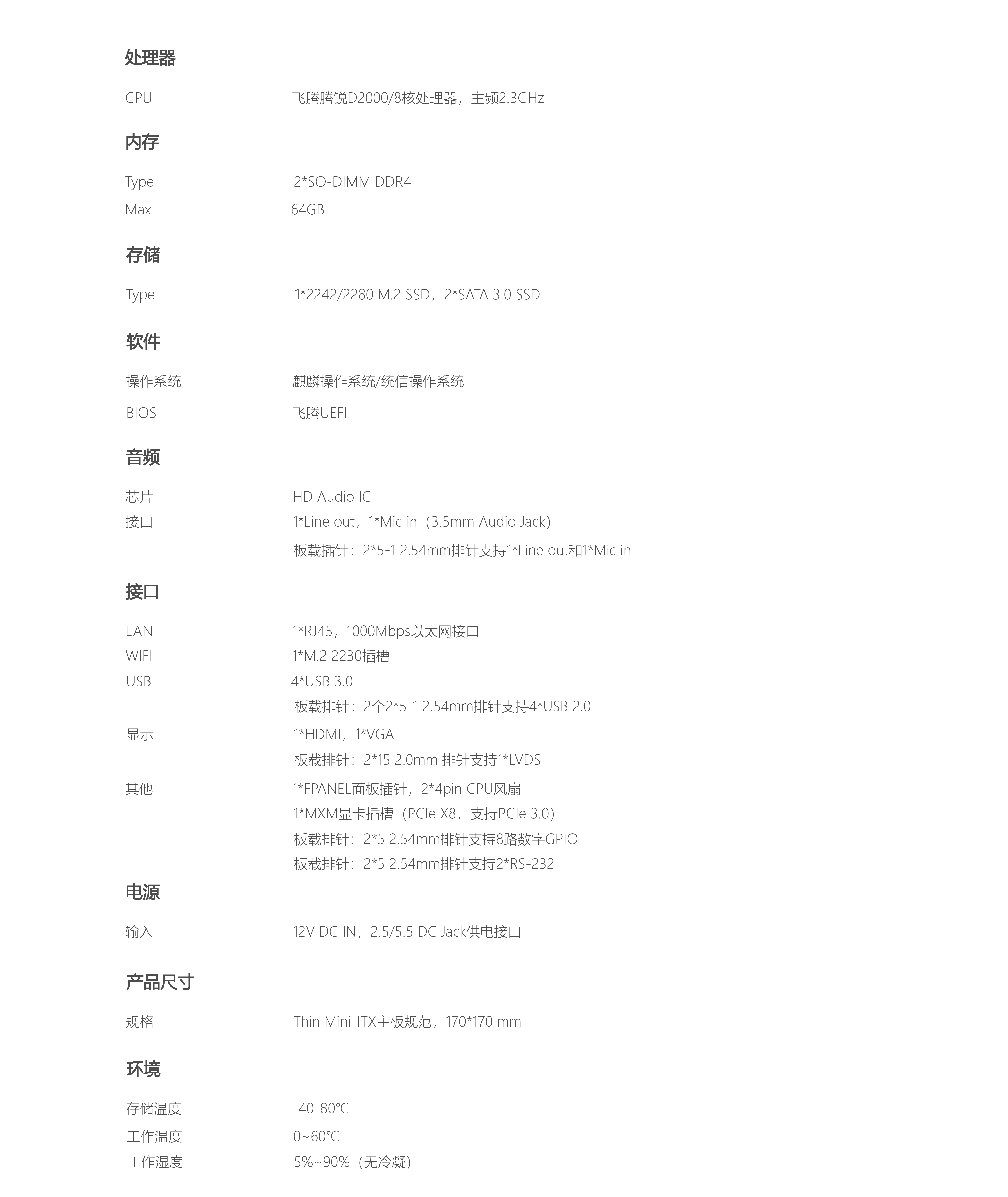 基于飞腾D2000 8核处理器,主频2.3GHz